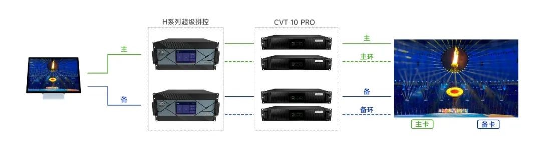 通過(guò)雙機(jī)4重備份保證現(xiàn)場(chǎng)畫(huà)面顯示萬(wàn)無(wú)一失。使用2套系統(tǒng)同時(shí)連接顯示屏,雙通道同時(shí)輸出信號(hào),4張發(fā)送卡連接箱體主、備接收卡建立信號(hào)回路,任意環(huán)節(jié)故障,立即按照優(yōu)先級(jí)迅速替換備份信號(hào),整個(gè)切換時(shí)間控制在微秒級(jí)別,確保顯示屏在顯示上不會(huì)出現(xiàn)任何異常現(xiàn)象。